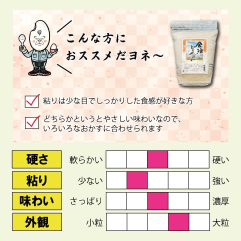 「見て美しさに一目惚れ、食べておいしさに一目惚れ」という名前の由来どおり、お米につやがあり、適度な粘りとさっぱりとした口あたりが特徴です。米粒は大きめでツヤがあり、見栄え良く料理に添えることができます。