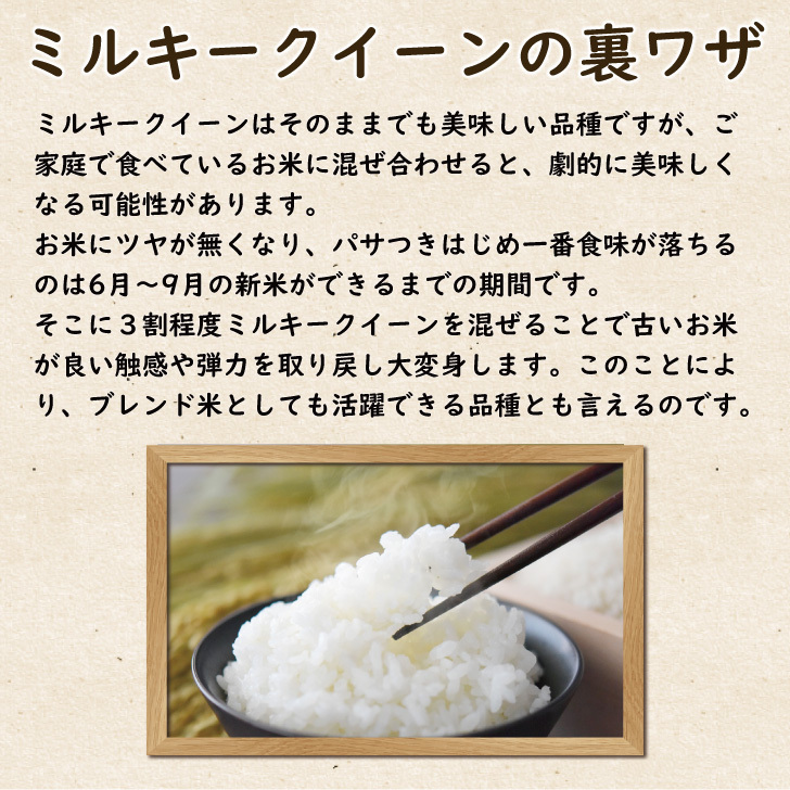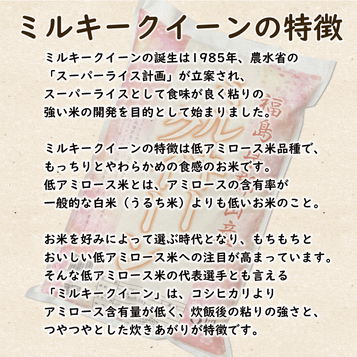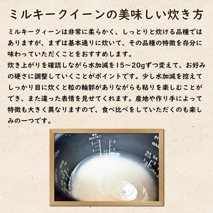 ミルキークイーンの特徴は低アミロース米品種で、もっちりとやわらかめの食感のお米です。